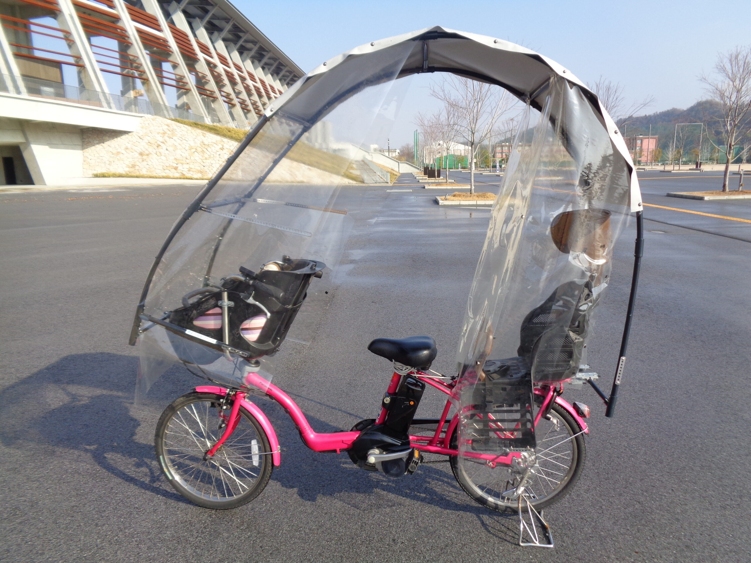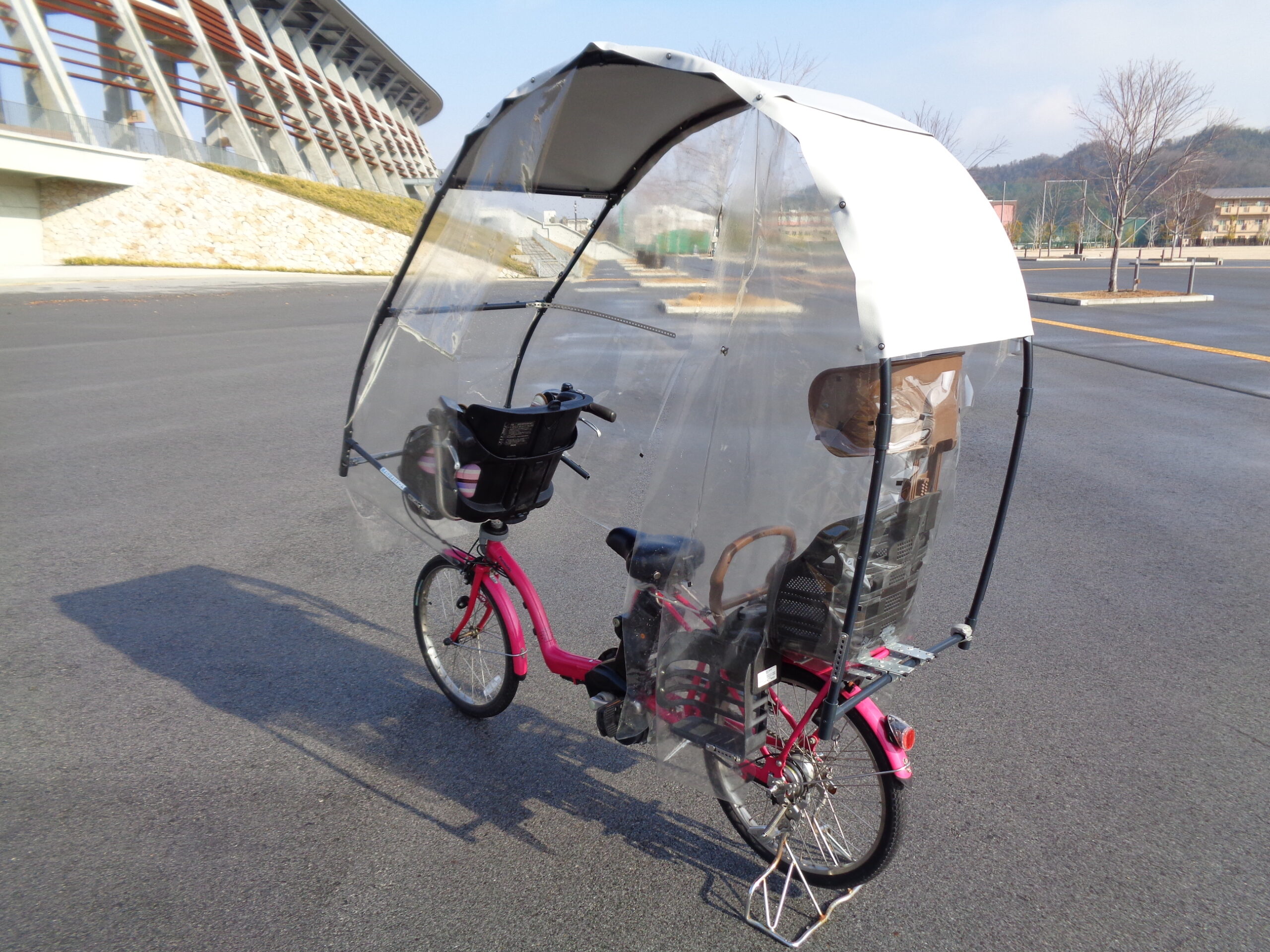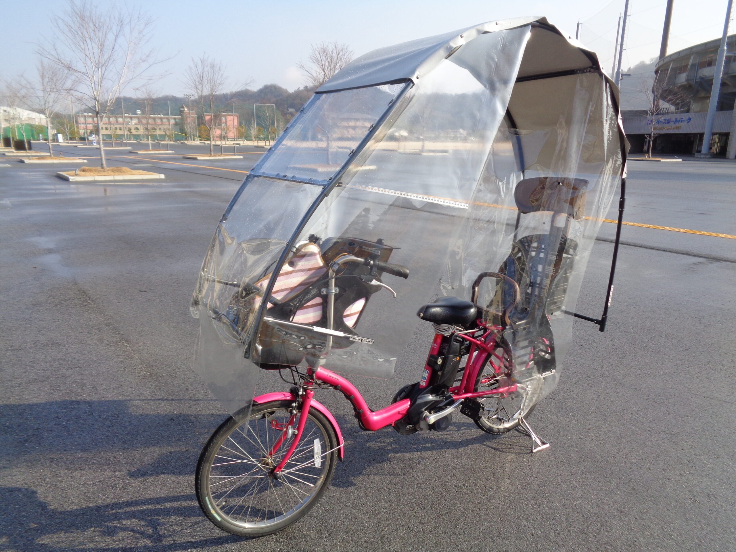 ↓自転車カバーをしている自転車で、親がカッパを着て、傘を立て、子供一人を園に送迎する場合。