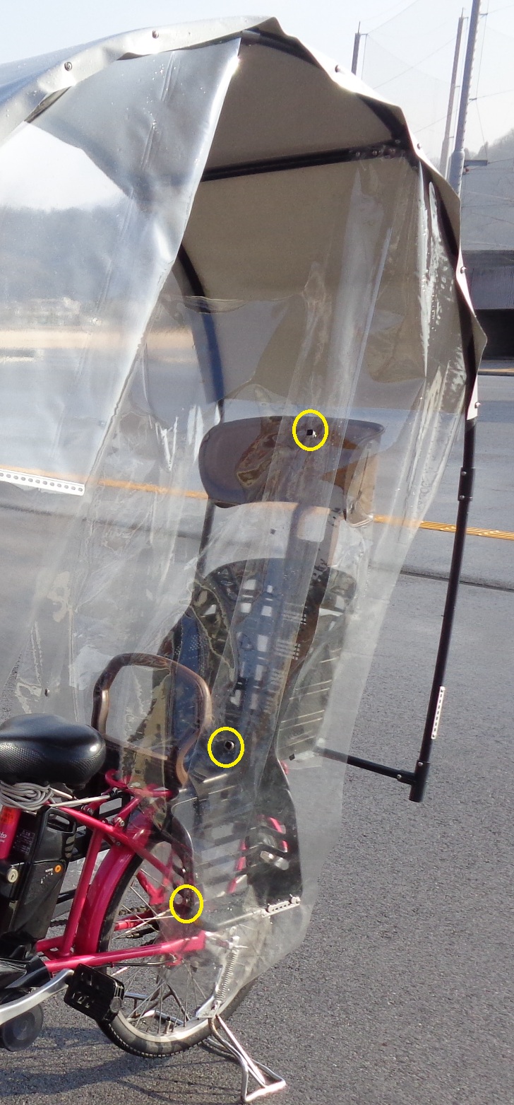 雨よけ日よけドームは風の抵抗を減らす構造にしていますが、それでも、屋根なし自転車やチャイルドシートレインカバーにくらべ、風の抵抗は受けますので、それをよく理解した上でご使用ください。