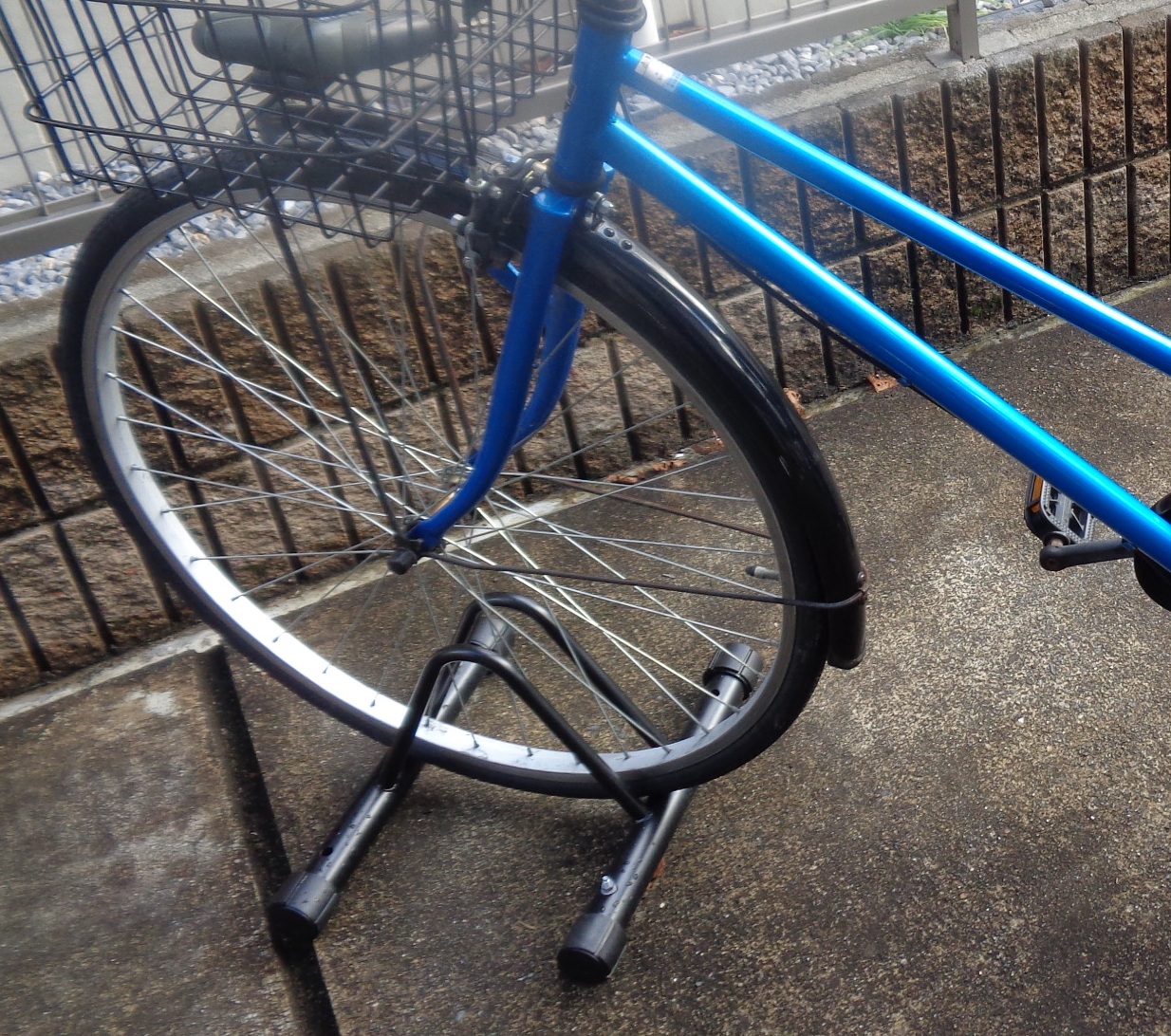 自宅駐輪場所が屋外などで風がある場合、転倒の可能性があります。一方、いちいちゴム紐で固定するのは面倒です。そういう場合、以下のような自転車専用スタンドを地面にアンカーで設置することをお勧めします。*アマゾンで1500円ほど(アンカー施工費別途)。