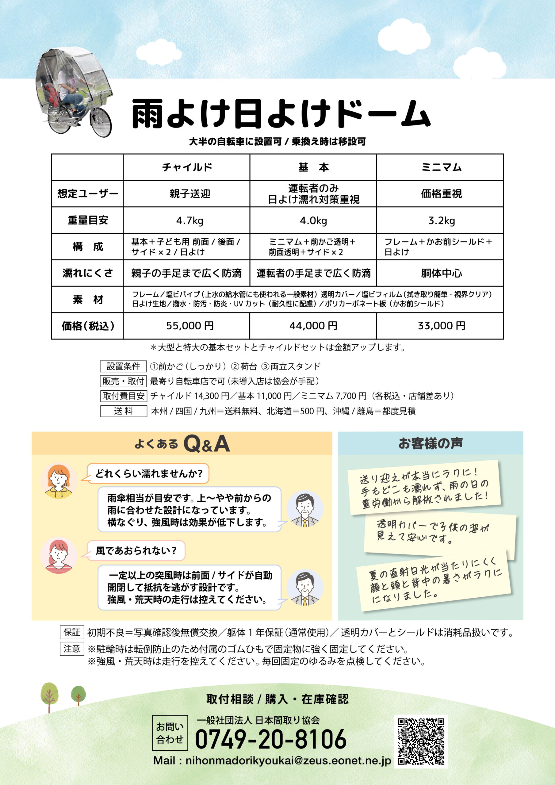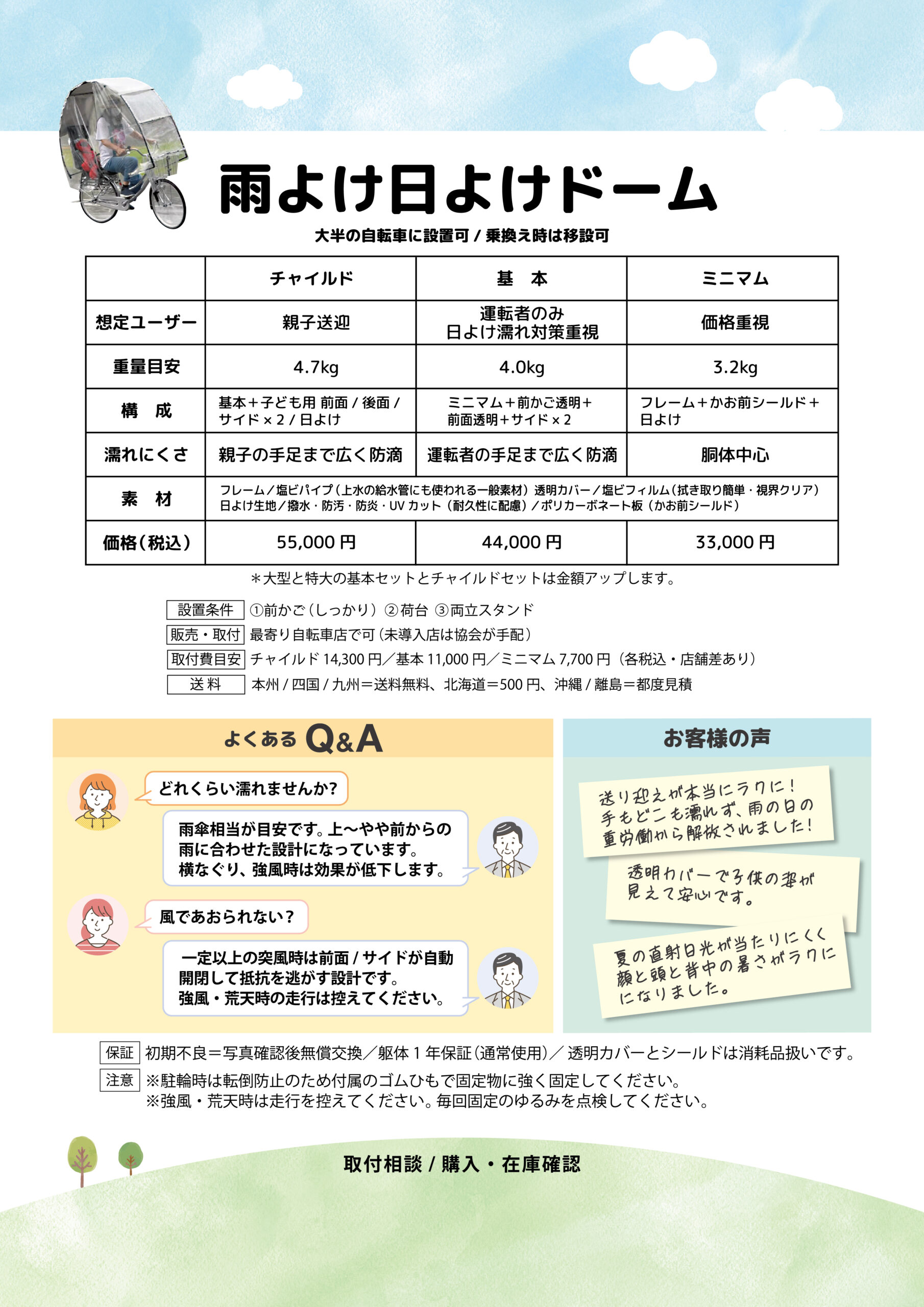 ↓雨よけ日よけドーム 販売店用チラシ(A4サイズ1項2項)。