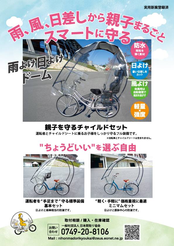 そこで、日本間取り協会が、自転車用の屋根「雨よけ日よけドーム」、を開発しました。