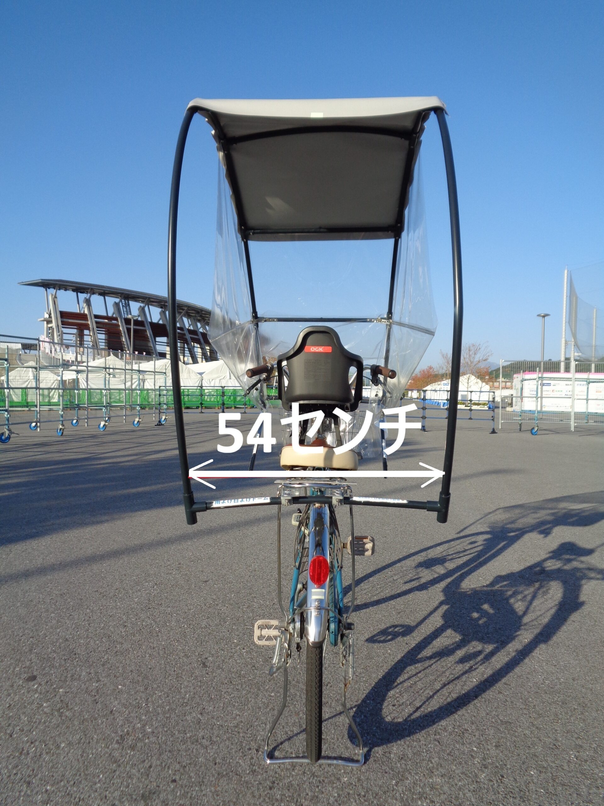 ↓自転車カバーをしている自転車で、親がカッパを着て、傘を立て、子供一人を園に送迎する場合。
